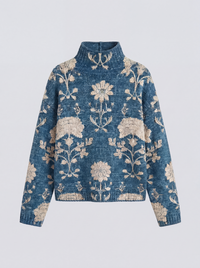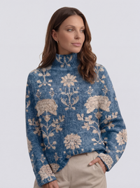 El tejido suave ofrece una sensación agradable al contacto con la piel, mientras que el cuello alto aporta abrigo adicional para los días fríos. Su corte relajado permite libertad de movimiento y un ajuste cómodo, perfecto para looks casuales o para dar un toque especial a un outfit básico. Cada detalle del estampado está cuidadosamente trabajado para crear una pieza armoniosa, cálida y visualmente cautivadora.