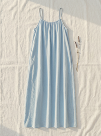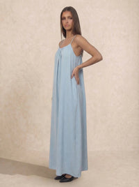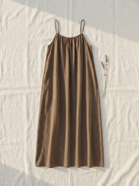 The Casa es un vestido lencero largo con tacto de lino, tirantes finos, escote fruncido y una espalda abierta que lo dice todo. Holgado, desenfadado, largo hasta los pies. El tipo de prenda que hace que el café del sábado por la mañana parezca una escena de película.