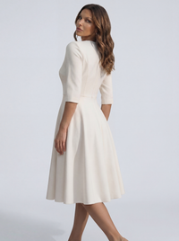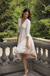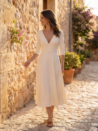 The Chiara tiene un escote en V profundo que alarga el cuello, un corpiño estructurado que define la cintura, y una falda midi con vuelo que se mueve contigo. Mangas 3/4 que estilizan los brazos. Costuras de sastrería que marcan la silueta sin apretar.