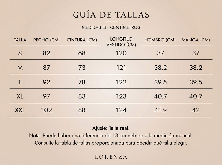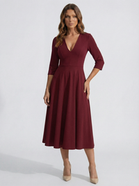 The Chiara tiene un escote en V profundo que alarga el cuello, un corpiño estructurado que define la cintura, y una falda midi con vuelo que se mueve contigo. Mangas 3/4 que estilizan los brazos. Costuras de sastrería que marcan la silueta sin apretar.