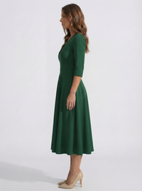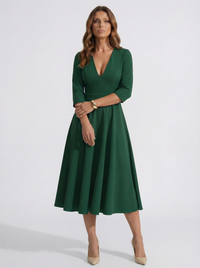 The Chiara tiene un escote en V profundo que alarga el cuello, un corpiño estructurado que define la cintura, y una falda midi con vuelo que se mueve contigo. Mangas 3/4 que estilizan los brazos. Costuras de sastrería que marcan la silueta sin apretar.