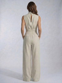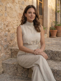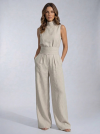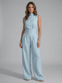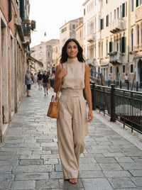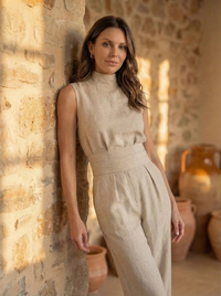 El conjunto que parece diseñado por un atelier pero que se siente como un pijama. Top sin mangas con cuello alto y pantalón de pernera ancha con pinzas y cintura alta. Dos piezas que funcionan juntas como un look completo o por separado con lo que ya tienes en el armario. Lino, caída natural y esa elegancia mínima que no necesita accesorios ni explicaciones. Para el brunch, la oficina en verano o el paseo por la costa que tienes en la cabeza.